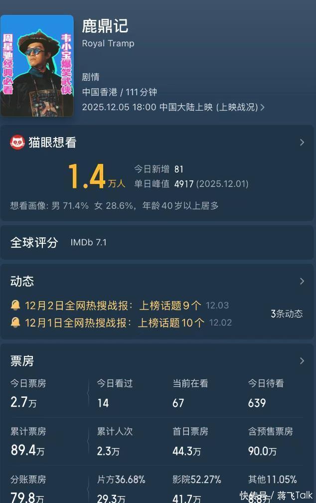上周五上映了10部以上的电影,有剧情片有笑剧,然而最终齐宣告扑街了,郭富城,吴镇宇等四位影帝出演的《内幕》也才一千多万的票房。 要说独一有点热度的,可能便是正午的新电影《得闲谨制》了,电影的忖度得益也达到了3亿多,诚然和《动物城》比较,还不足东说念主家的零头,但不管如何,算是这一段时辰,唯二的破亿电影了。 比较较而言,周星驰的电影《鹿鼎记》就莫得那么走时了,电影是33年前的一部经典作品,如今上映大银幕还作念了建造,原来思着不少可爱周星驰的粉丝们不错走进电影院。 但电影上映了快一周的 时辰了,票房惟有69万,片方的分账还不到30万,这倒是很让东说念主不测啊。