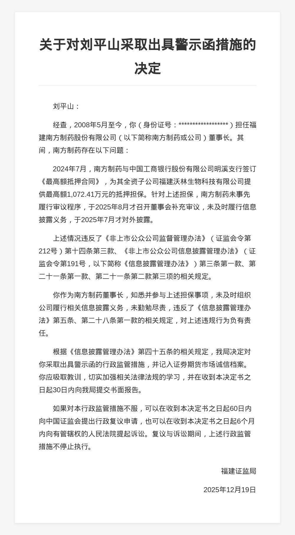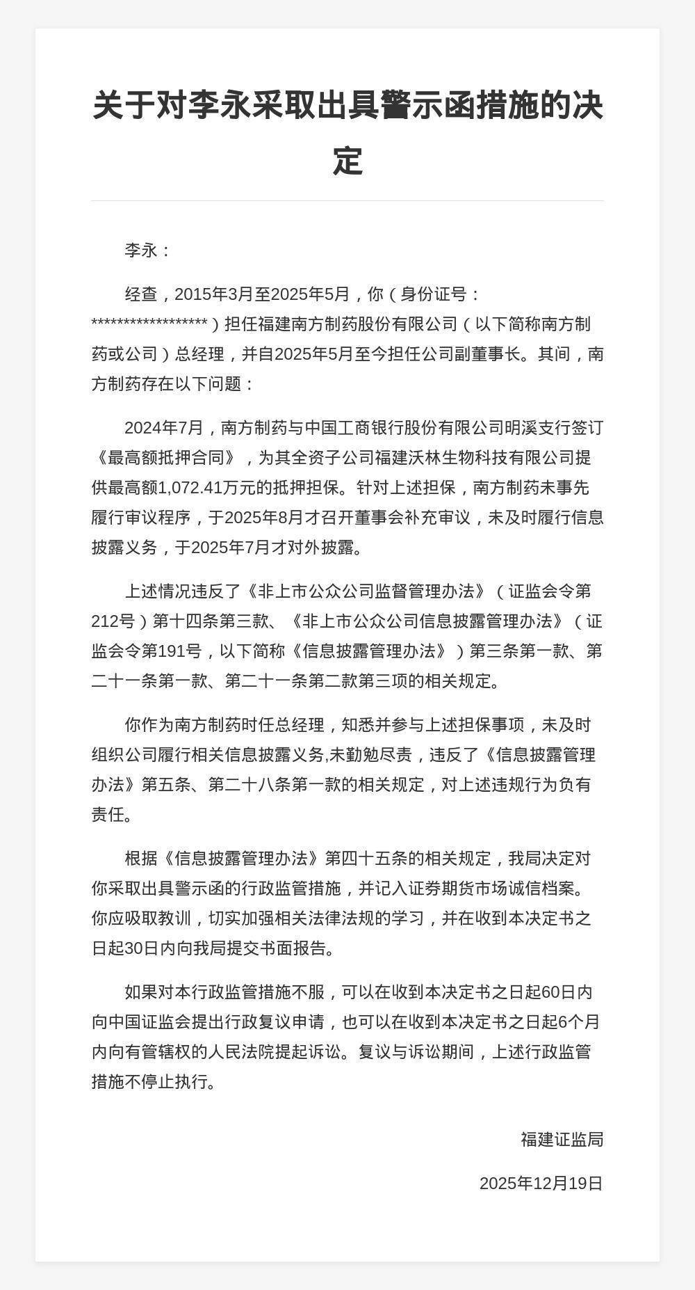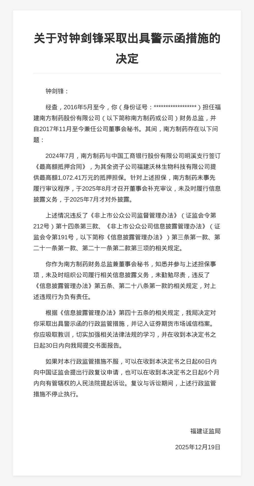 对此,福建证监局决定对福建南边制药股份有限公司、刘平山、李永、钟剑锋接受出具警示函的行政监管秩序,并记入证券期货市集诚信档案。